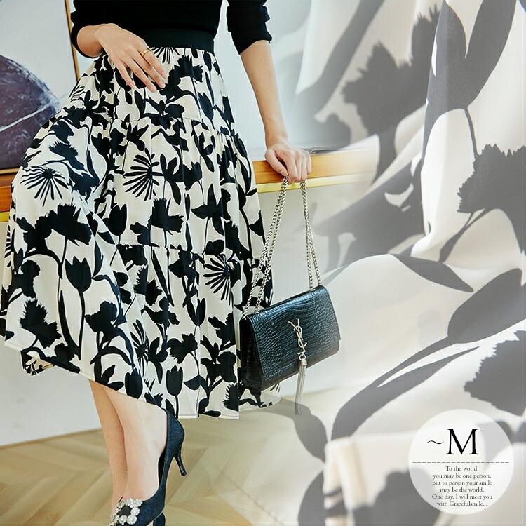 ボトムス スカート フレアスカート 総柄 花柄 モノトーン 白黒 膝丈 フェミニン ガーリー ブラック ホワイト食事会 女子旅 お洒落 Tcz Tcz ライバルはデパートgracefulsmile 通販 Yahoo ショッピング